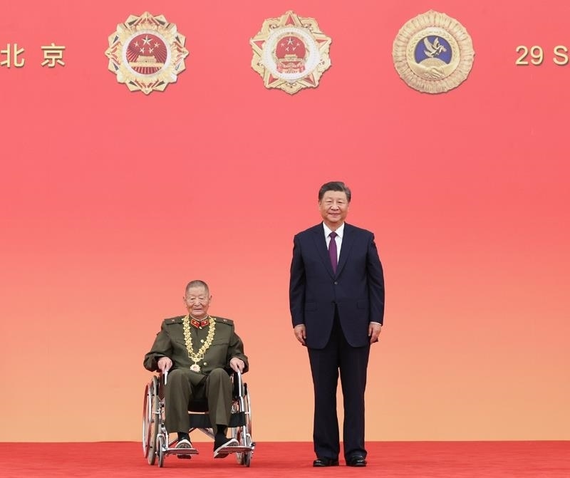 △2024年9月29日,國家勛章和國家榮譽(yù)稱號頒授儀式上,習(xí)近平總書記向“共和國勛章”獲得者黃宗德頒授勛章后合影。