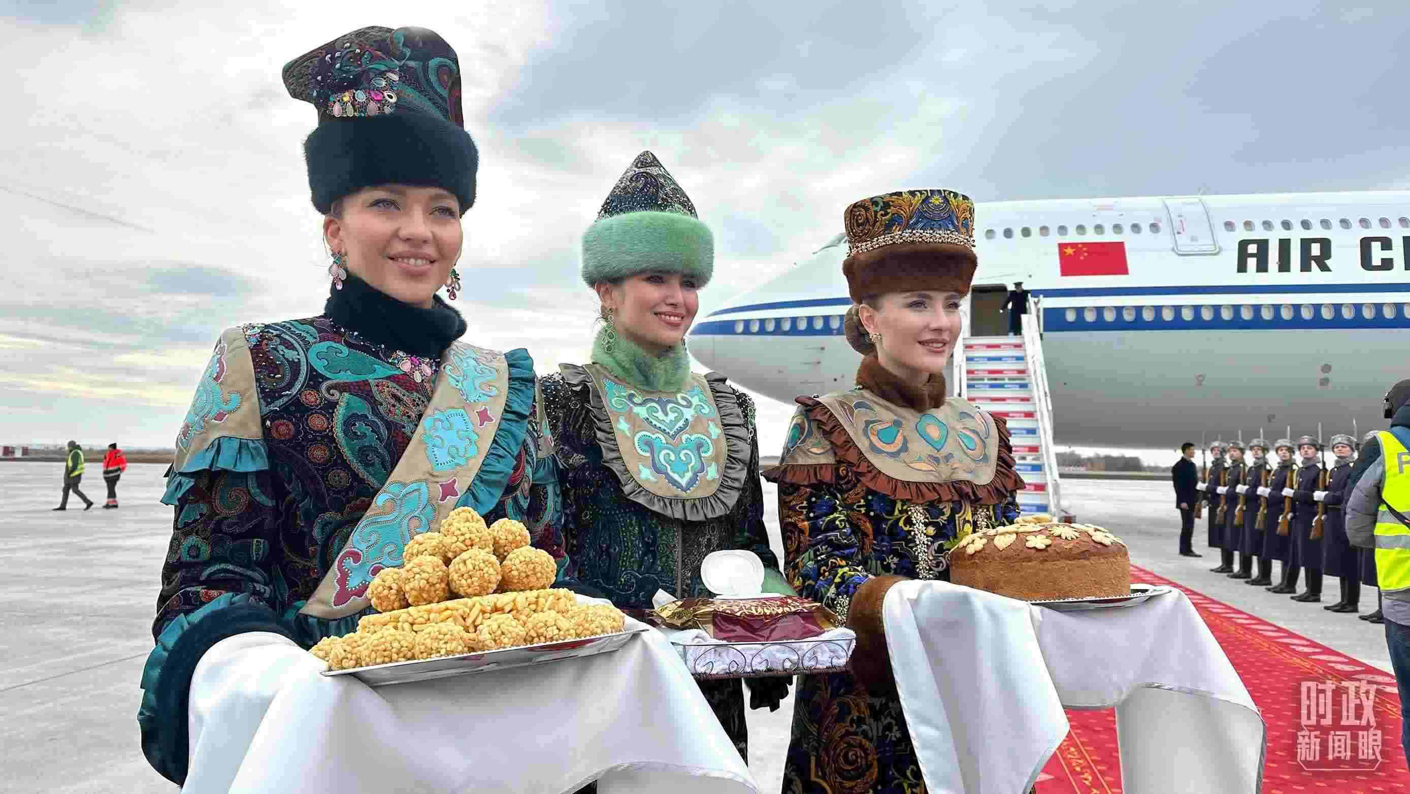 △ 習(xí)主席專機(jī)抵達(dá)喀山國際機(jī)場時,禮兵在紅毯兩側(cè)列隊致敬,身著民族服裝的俄羅斯女青年用傳統(tǒng)禮節(jié)表示歡迎。(總臺央視記者盧心雨拍攝)