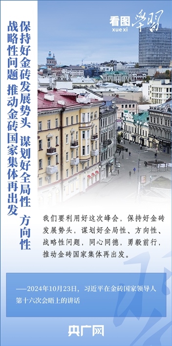 當(dāng)?shù)貢r(shí)間10月23日,國家主席習(xí)近平在俄羅斯喀山出席金磚國家領(lǐng)導(dǎo)人第十六次會(huì)晤并發(fā)表重要講話。習(xí)主席深刻闡述推動(dòng)“大金磚合作”高質(zhì)量發(fā)展的中國主張,就金磚大家庭發(fā)展合作提出五點(diǎn)務(wù)實(shí)舉措,表達(dá)了中方愿同金磚各國一道,攜手更多“全球南方”國家共同推動(dòng)構(gòu)建人類命運(yùn)共同體的真誠愿望。一起來學(xué)習(xí)!