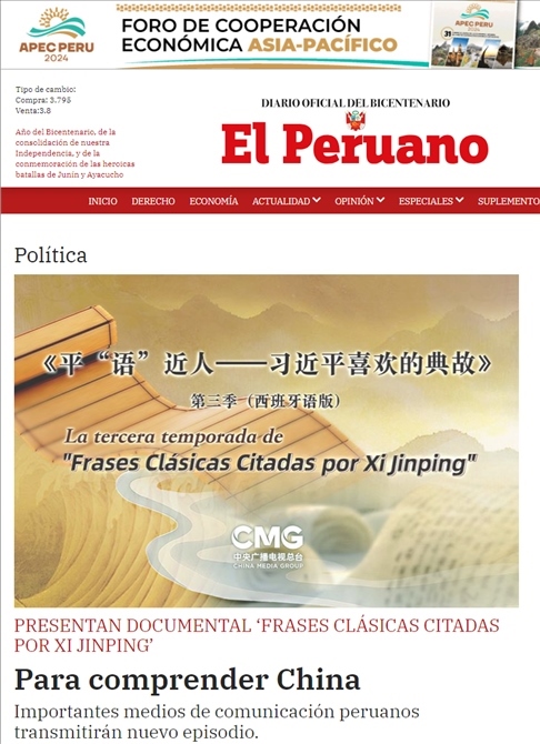 在中國國家主席習(xí)近平應(yīng)秘魯共和國總統(tǒng)博魯阿爾特邀請,赴利馬出席亞太經(jīng)合組織第三十一次領(lǐng)導(dǎo)人非正式會議并對秘魯進行國事訪問之際,由中國中央廣播電視總臺制作的《平“語”近人——習(xí)近平喜歡的典故》第三季(西班牙語版),將于當?shù)貢r間11月14日起在秘魯國家廣播電視臺、秘魯電視聯(lián)播網(wǎng)、秘魯廣播節(jié)目集團電視端等多平臺落地播出。當?shù)囟嗉抑髁髅襟w對節(jié)目落播進行預(yù)告,引發(fā)秘魯各界普遍期待和廣泛關(guān)注。
