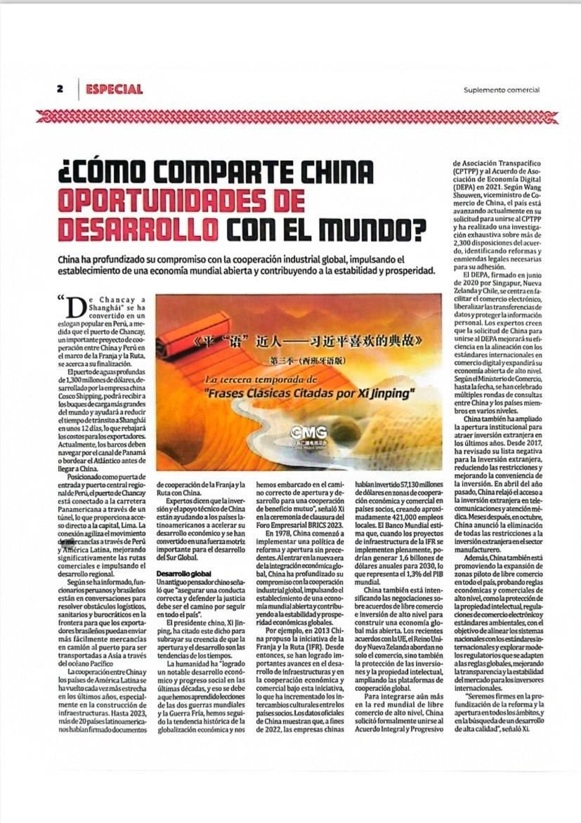 11月14日,秘魯最具影響力的官方報紙《秘魯人報》刊發(fā)節(jié)目在秘魯落播的消息。文章指出,《平“語”近人——習(xí)近平喜歡的典故》第三季展現(xiàn)了中華民族開放包容、兼收并蓄的文化胸懷,闡釋了習(xí)近平主席提出的推動構(gòu)建人類命運共同體的這一重大理念,是對“建設(shè)一個什么樣的世界、怎樣建設(shè)這個世界”給出的中國方案?!睹佤斎藞蟆诽乜婵l(fā)《平“語”近人——習(xí)近平喜歡的典故》第三季(西班牙語版)將在秘魯主流媒體落播特稿?!睹佤斎藞蟆饭倬W(wǎng)也同步刊發(fā)了節(jié)目預(yù)告消息和海報。