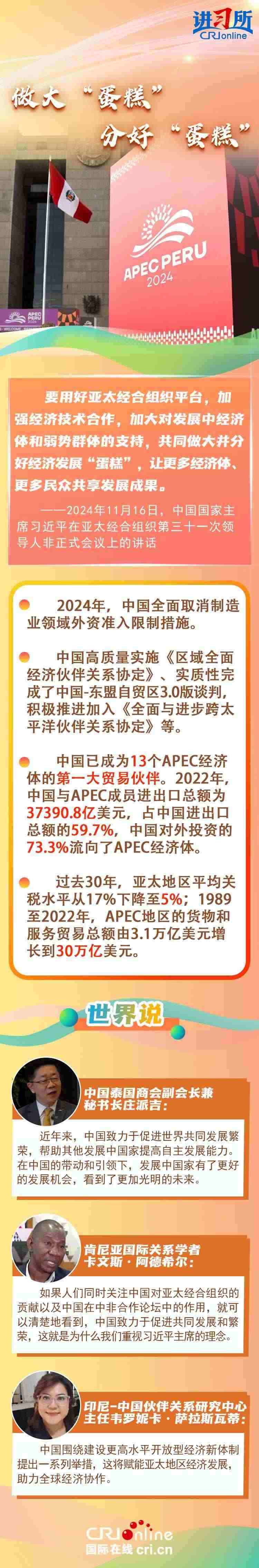 自1991年加入APEC以來,中國作為關(guān)鍵一員,持續(xù)為亞太地區(qū)成為世界經(jīng)濟(jì)的“火車頭”輸出關(guān)鍵穩(wěn)定力量,習(xí)近平主席表示,“落其實者思其樹,飲其流者懷其源”。中國的發(fā)展離不開亞太,也將進(jìn)一步造福亞太。多國人士表示,在中國的帶動和引領(lǐng)下,發(fā)展中國家有了更好的發(fā)展機(jī)會,看到了更加光明的未來。