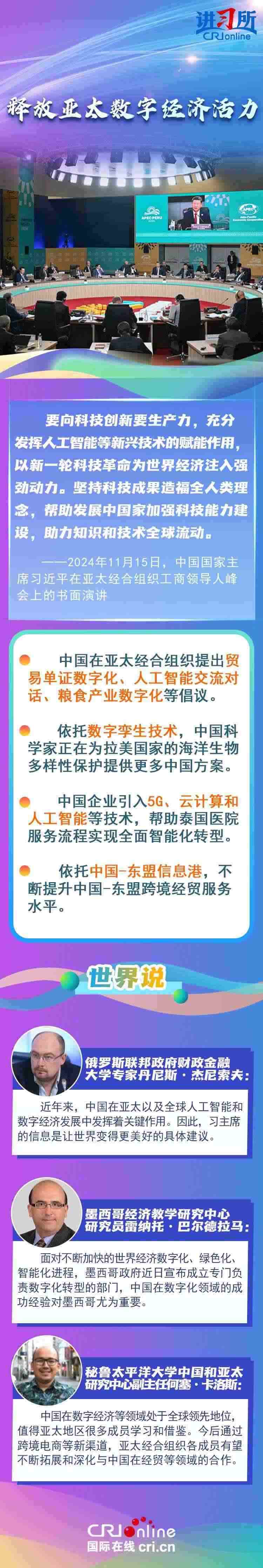 亞太之大,容得下大家共同發(fā)展。當(dāng)前單邊主義、保護(hù)主義蔓延,世界經(jīng)濟(jì)正經(jīng)受逆水行舟、不進(jìn)則退的嚴(yán)峻考驗。習(xí)近平主席從促進(jìn)亞太合作大局出發(fā),圍繞“綠色”“創(chuàng)新”“普惠包容”等議題,闡釋中國行動,強(qiáng)調(diào)要守正創(chuàng)新,擦亮開放亞太、包容亞太的金字招牌,打造綠色亞太、數(shù)字亞太的新招牌,推動構(gòu)建亞太命運(yùn)共同體。