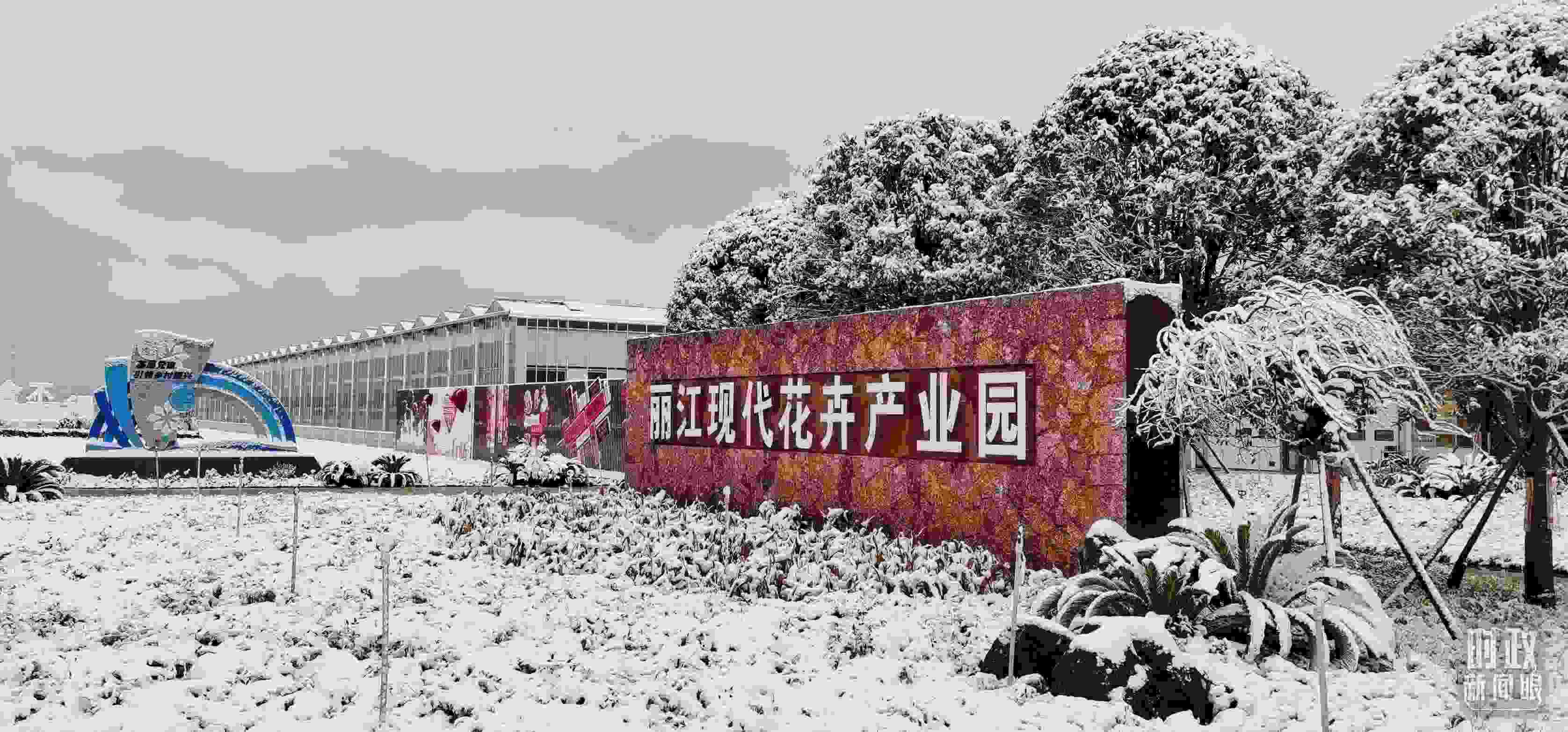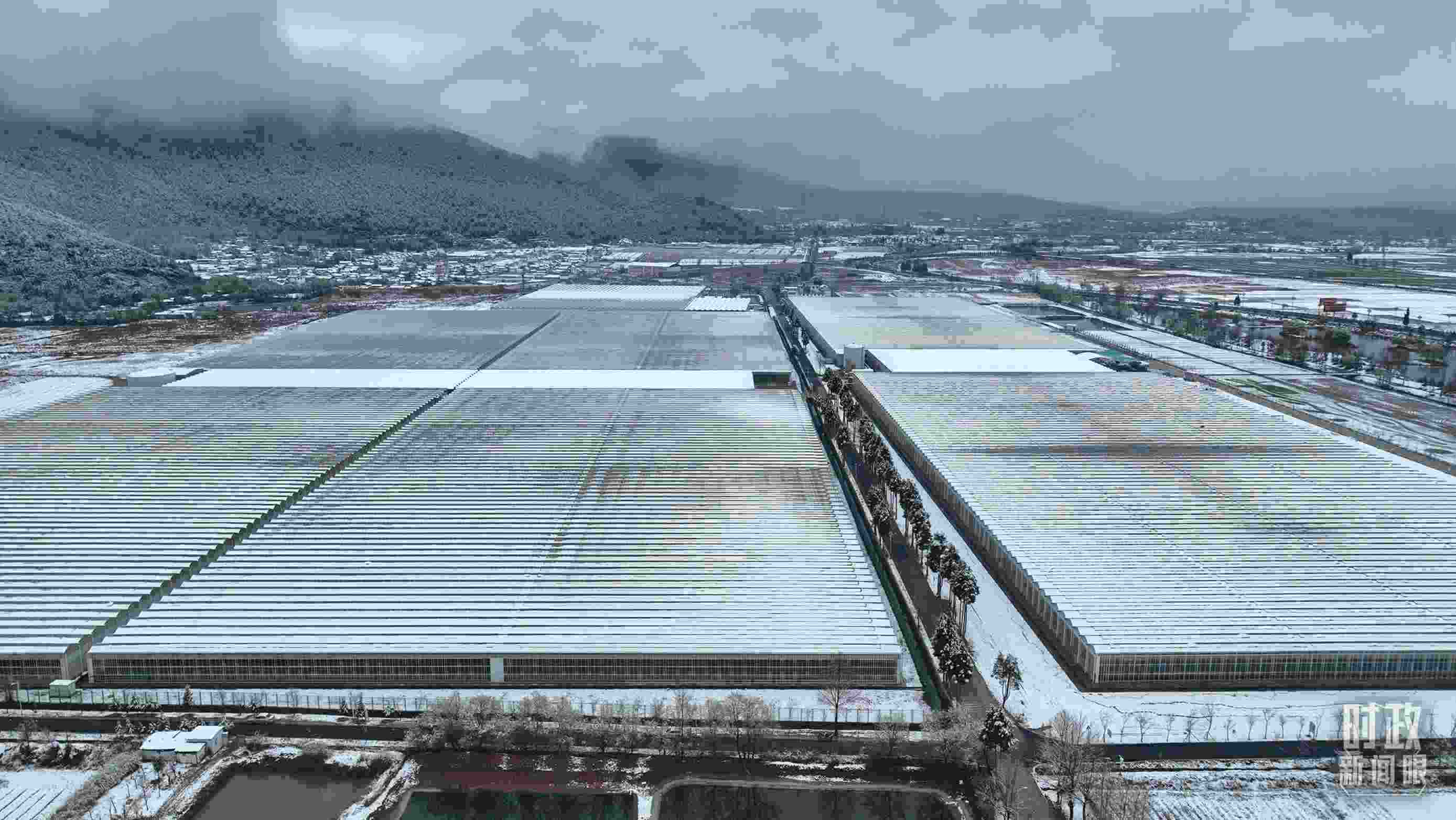 △銀裝素裹的麗江現(xiàn)代花卉產(chǎn)業(yè)園。(總臺央視記者郭鴻拍攝)