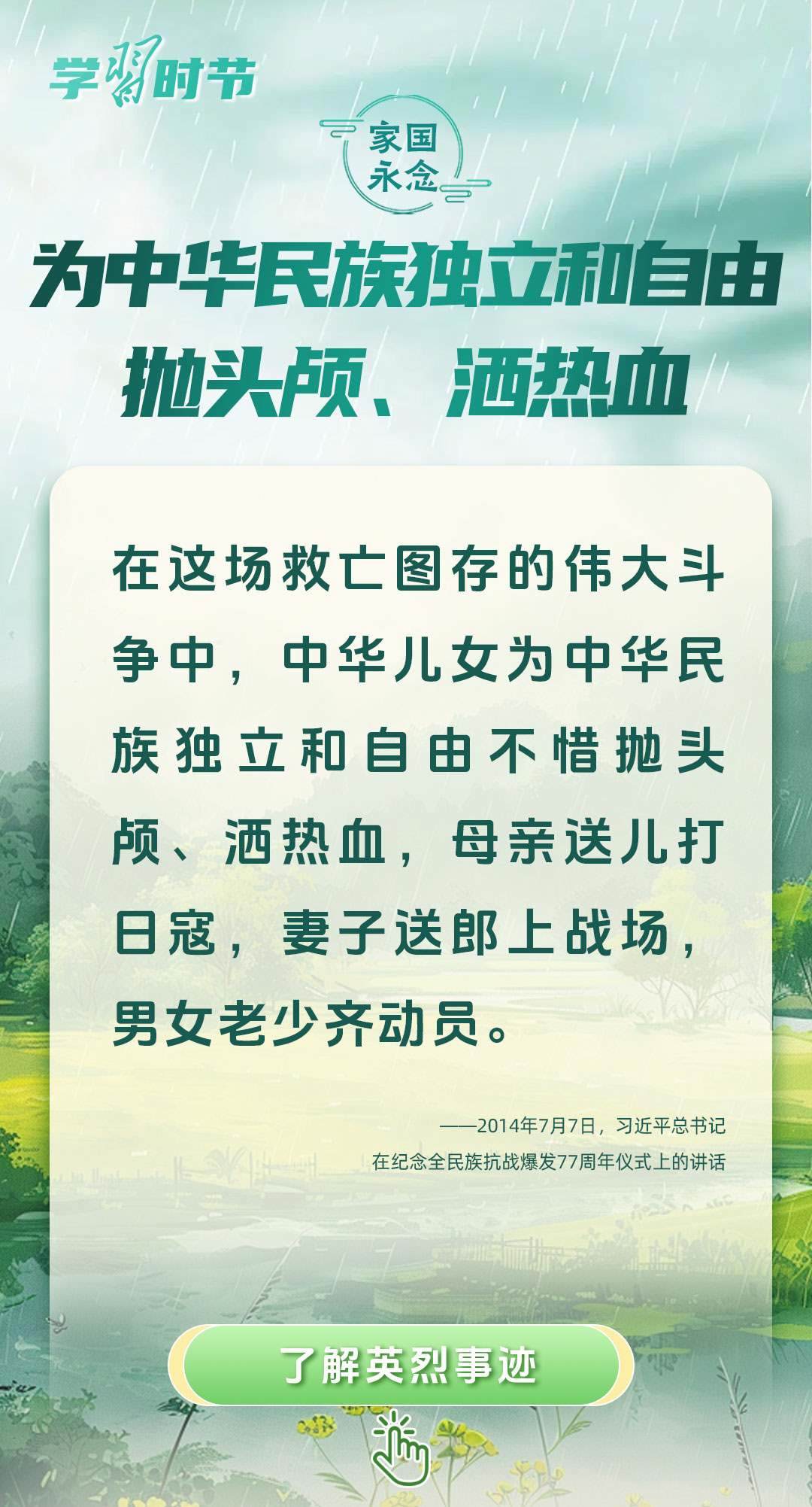 今年是中國(guó)人民抗日戰(zhàn)爭(zhēng)暨世界反法西斯戰(zhàn)爭(zhēng)勝利80周年、中國(guó)人民志愿軍抗美援朝出國(guó)作戰(zhàn)75周年。習(xí)近平總書(shū)記曾說(shuō):“對(duì)一切為國(guó)家、為民族、為和平付出寶貴生命的人們,不管時(shí)代怎樣變化,我們都要永遠(yuǎn)銘記他們的犧牲和奉獻(xiàn)?!苯裉煳覀兯鶕碛械囊磺?,無(wú)不凝結(jié)著英雄、英烈們的奉獻(xiàn)付出乃至巨大犧牲。