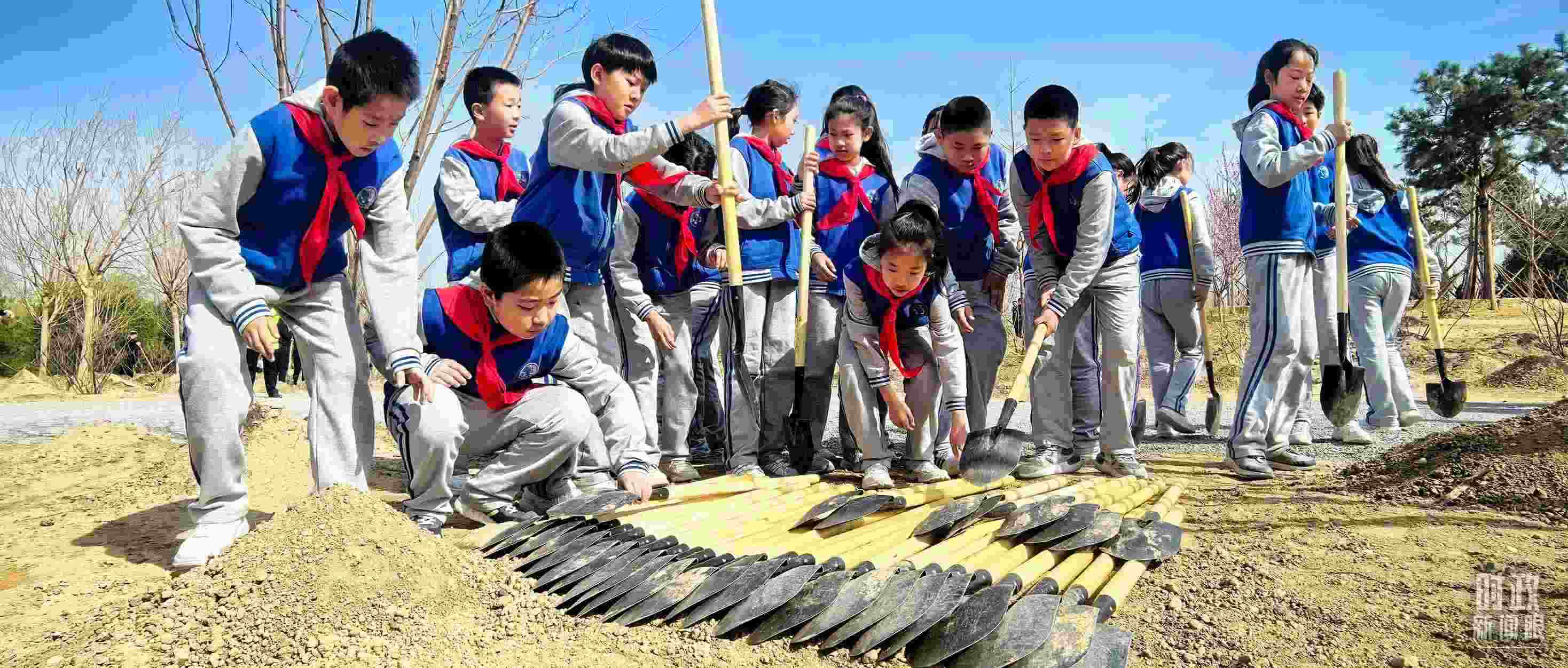 △少先隊(duì)員拿起鐵鍬參加義務(wù)植樹(shù)。(總臺(tái)央視記者范凱拍攝)