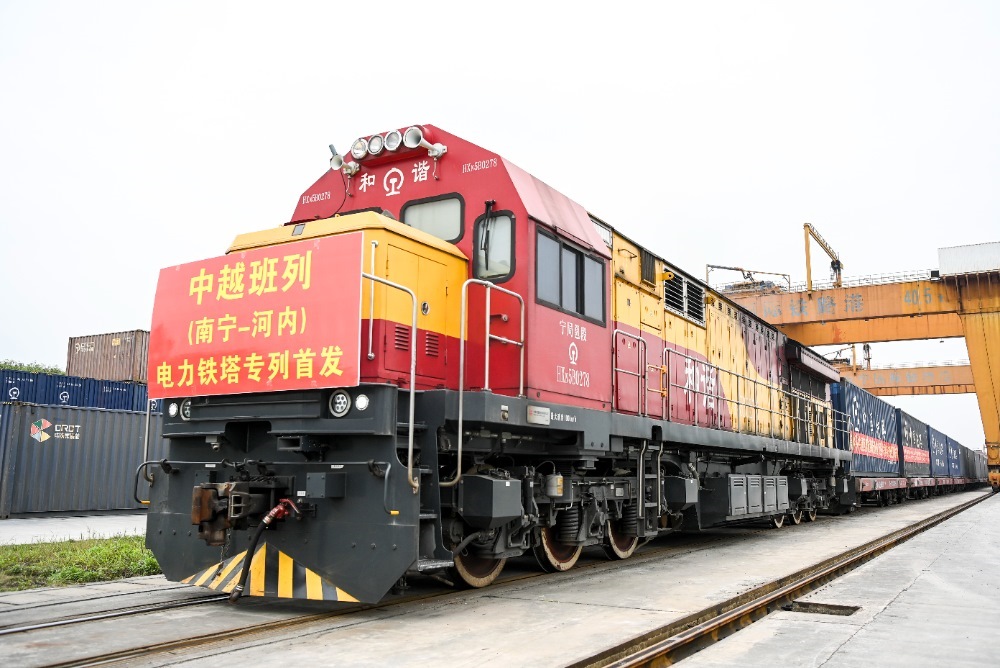 2024年3月8日,在廣西南寧國(guó)際鐵路港,電力鐵塔專列準(zhǔn)備發(fā)車。當(dāng)日,一列滿載340噸電力鐵塔的中越班列從南寧國(guó)際鐵路港開出,發(fā)往越南河內(nèi)。新華社記者 曹祎銘 攝