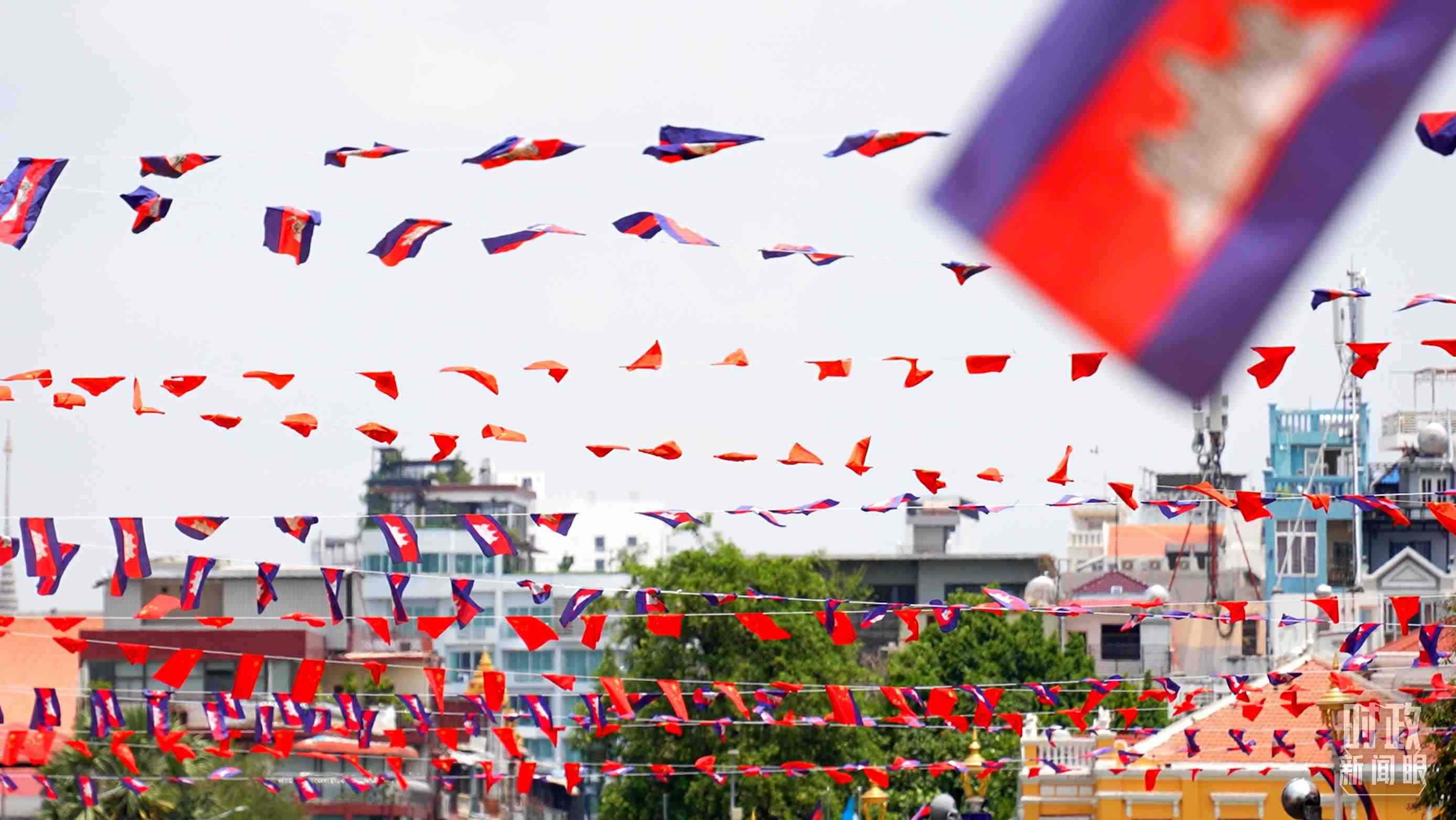 △金邊街頭懸掛的中柬兩國國旗。(總臺(tái)央視記者盧心雨拍攝)