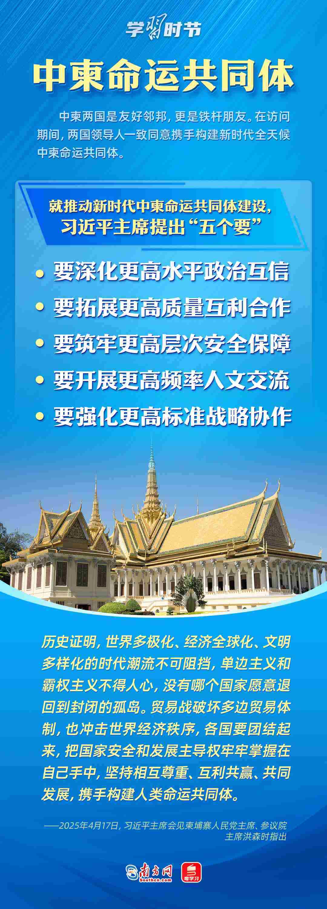 日前,中央周邊工作會(huì)議召開(kāi),強(qiáng)調(diào)要聚焦構(gòu)建周邊命運(yùn)共同體,努力開(kāi)創(chuàng)周邊工作新局面。4月14日至18日,習(xí)近平主席出訪東南亞三國(guó)——越南、馬來(lái)西亞、柬埔寨。這是習(xí)近平主席今年首次出訪,對(duì)推動(dòng)中國(guó)同三國(guó)關(guān)系發(fā)展具有重大意義,也為周邊命運(yùn)共同體建設(shè)擘畫了新藍(lán)圖。