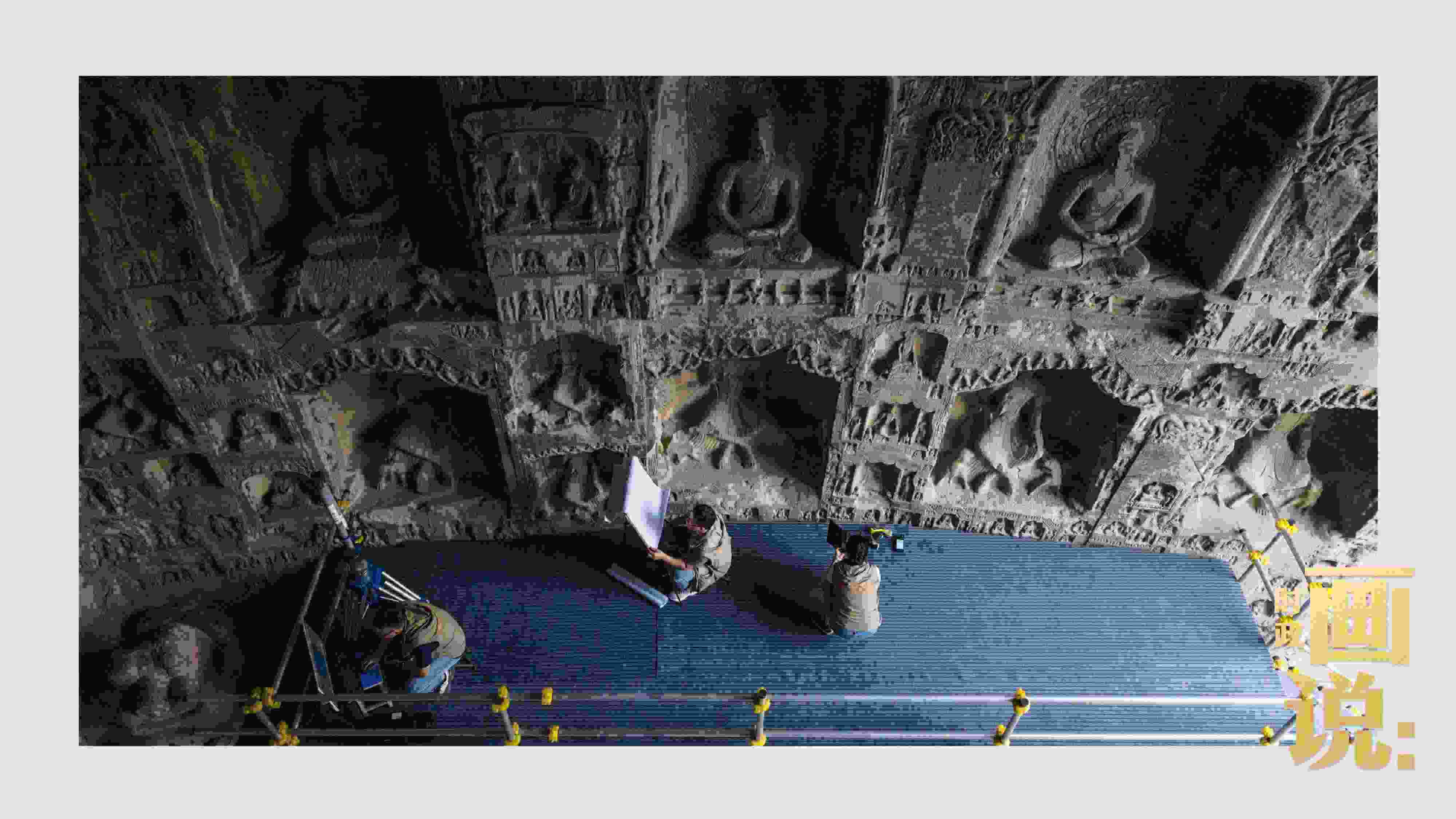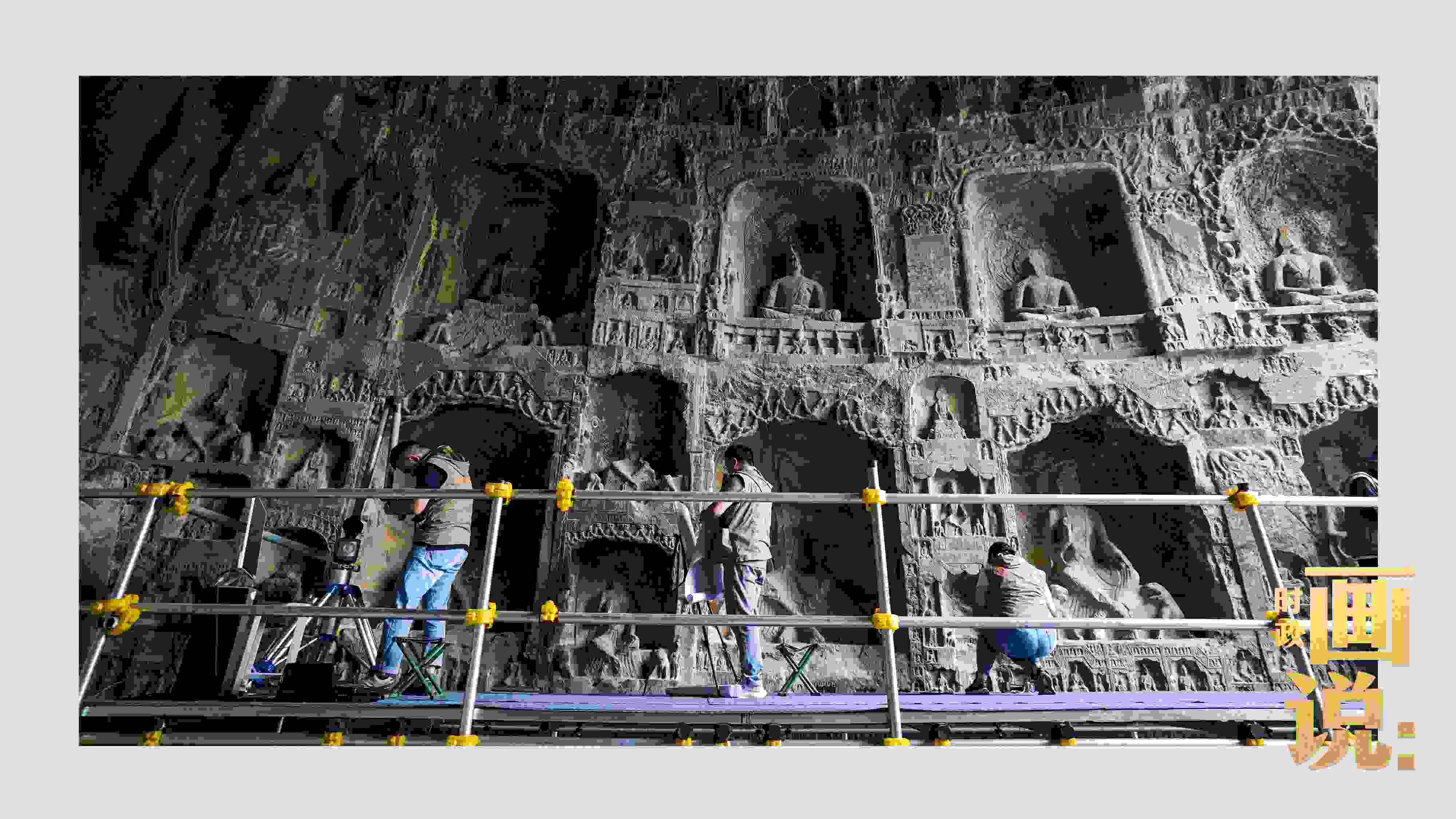 △龍門石窟研究院工作人員在古陽(yáng)洞使用關(guān)節(jié)臂掃描儀對(duì)佛像進(jìn)行數(shù)字化掃描