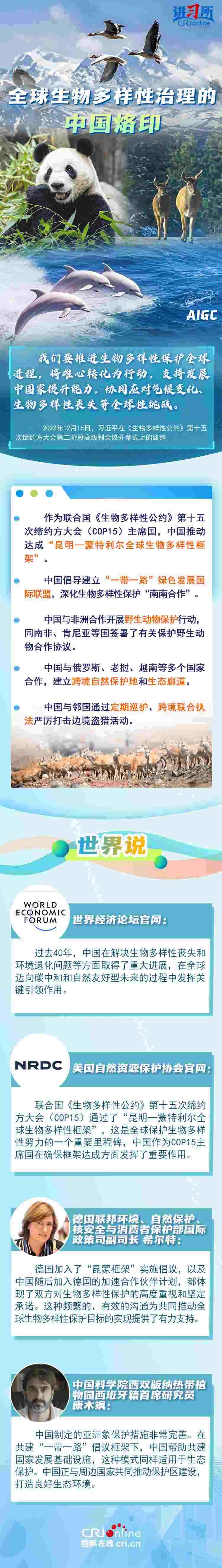 “心往一處想、勁往一處使,共建地球生命共同體?!弊鳛樽钤绾炇稹⑴鷾?zhǔn)《生物多樣性公約》的締約方之一,生物多樣性保護(hù)已經(jīng)上升為中國的國家發(fā)展戰(zhàn)略。國際人士表示,中國的一系列舉措體現(xiàn)出對生態(tài)環(huán)境保護(hù)的堅定決心,同時,中國依托共建“一帶一路”倡議等國際合作機(jī)制,為推動全球生物多樣性保護(hù)提供了有力支持,在邁向自然友好型未來的過程中發(fā)揮關(guān)鍵的引領(lǐng)作用。