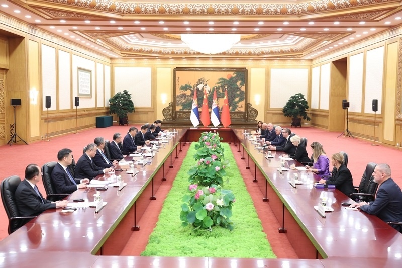 9月4日下午,國家主席習(xí)近平在北京人民大會堂會見來華出席紀(jì)念中國人民抗日戰(zhàn)爭暨世界反法西斯戰(zhàn)爭勝利80周年活動的塞爾維亞總統(tǒng)武契奇。新華社記者 丁林 攝