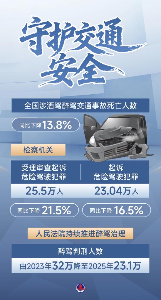 最高法報(bào)告指出,辦理醉駕刑事案件意見出臺(tái)后,判刑人數(shù)由2023年32萬降至2025年23.1萬,因酒駕造成交通事故及致死、致傷數(shù)量均有下降。同時(shí),明確“駕駛?cè)俗砭坪髥⒂幂o助駕駛功能仍應(yīng)承擔(dān)刑事責(zé)任”。
