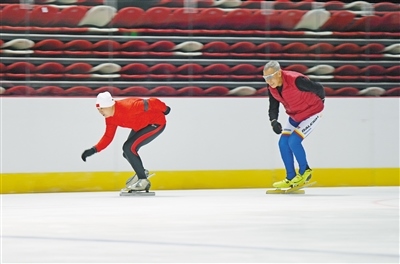 市民在呼和浩特體育中心綜合體育館冰場內滑冰。 記者 孟和朝魯 攝