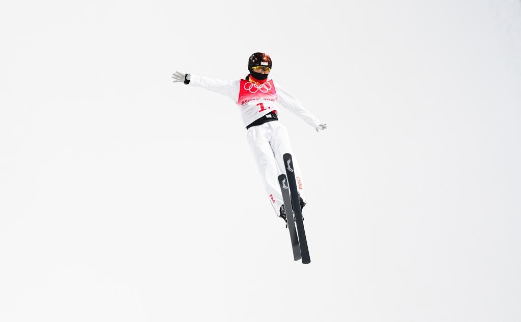 2月10日,中國(guó)隊(duì)選手徐夢(mèng)桃在北京冬奧會(huì)自由式滑雪空中技巧混合團(tuán)體決賽中。新華社記者許暢攝