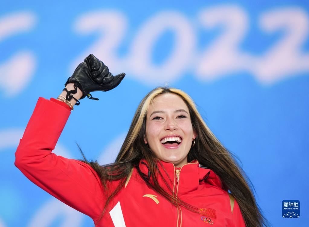 2月18日,冠軍中國隊(duì)選手谷愛凌在自由式滑雪女子U型場地技巧獎(jiǎng)牌頒發(fā)儀式上。新華社記者薛玉斌攝