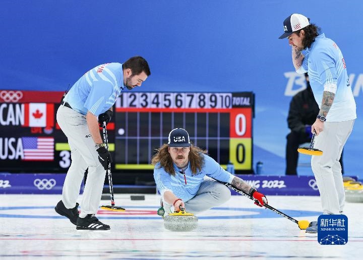 2月18日,美國隊(duì)選手馬特·漢密爾頓(中)在冰壺男子銅牌賽比賽中擲壺。新華社記者王婧嬙攝