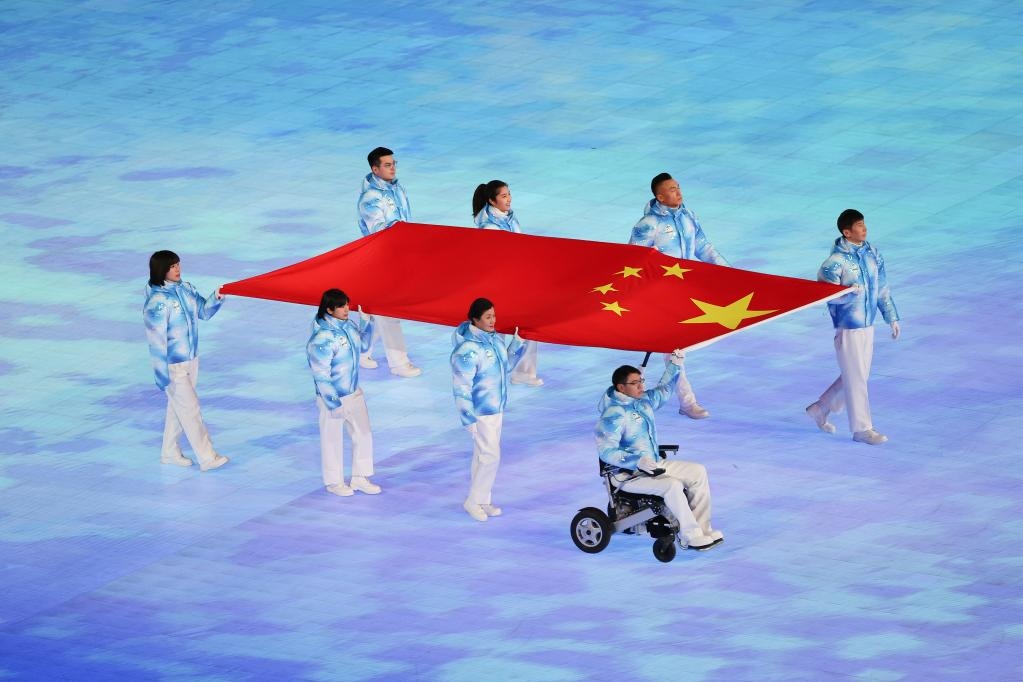 3月4日晚,北京2022年冬殘奧會(huì)開幕式在北京國(guó)家體育場(chǎng)舉行。這是中華人民共和國(guó)國(guó)旗入場(chǎng)。新華社記者 馬希平 攝