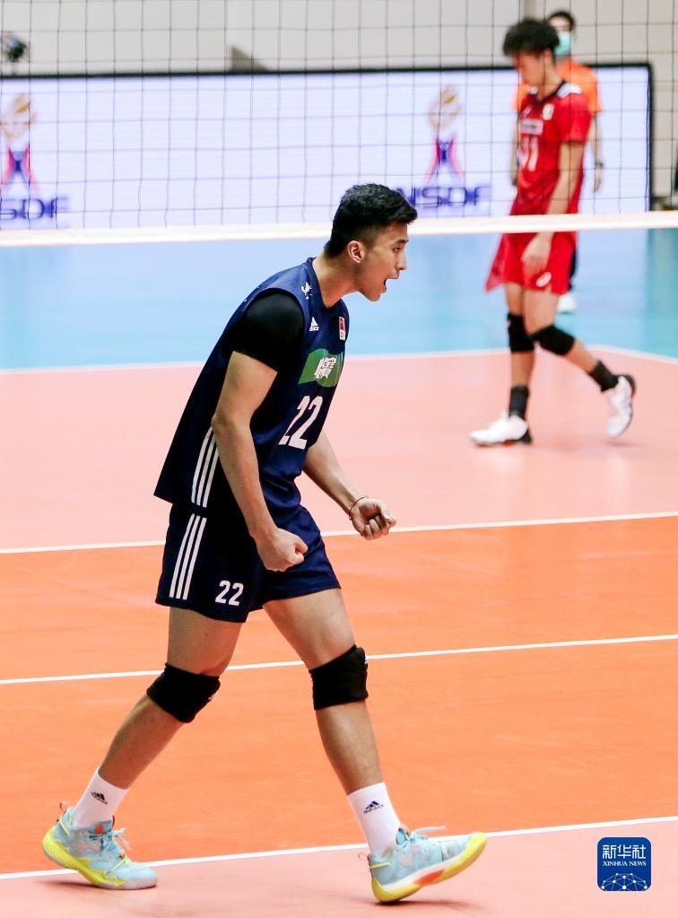 8月14日,中國(guó)隊(duì)球員張景胤(左一)在比賽中扣球。新華社記者 王騰 攝