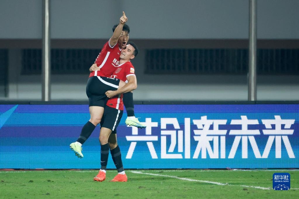 11月7日,成都蓉城隊球員金敃友(左)進球后與隊友周定洋慶祝。新華社記者 沈伯韓 攝