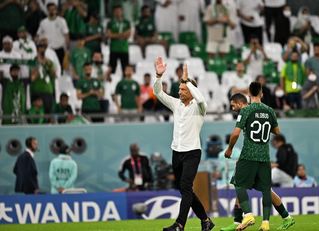 11月26日,沙特阿拉伯隊(duì)主教練勒納爾(左)賽后向觀眾致意。新華社記者 辛悅衛(wèi) 攝