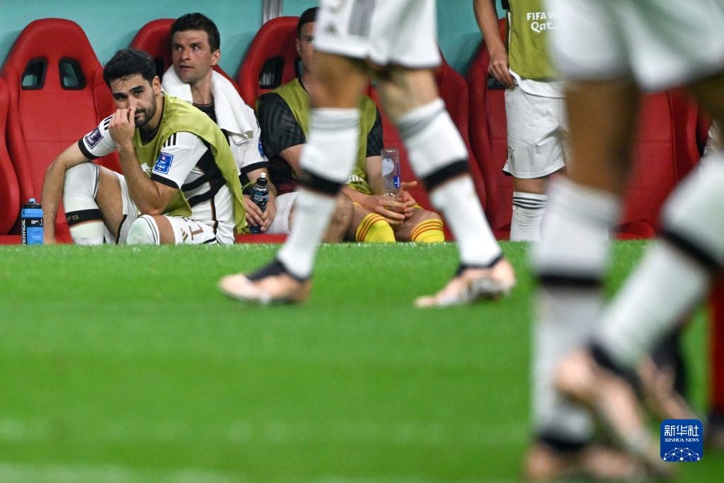 11月27日,德國(guó)隊(duì)球員伊爾凱·京多安(左一)與托馬斯·穆勒(左二)在比賽中被替換下場(chǎng)后。新華社記者 李尕 攝