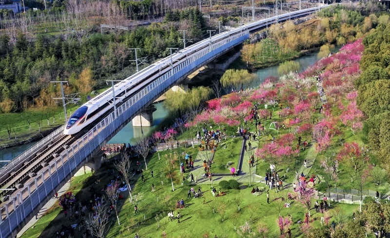 一列動(dòng)車組列車從合肥市匡河公園邊駛過。中國鐵路上海局集團(tuán)有限公司供圖