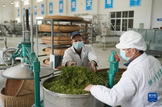 4月6日,工作人員在紫陽縣煥古鎮(zhèn)一家茶企車間內(nèi)工作。