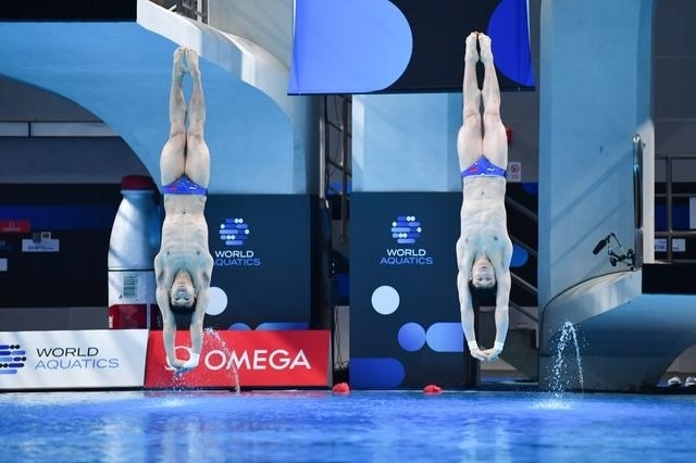 隨后開賽的男子雙人10米跳臺決賽中,中國隊組合楊昊/練俊杰在6輪比拼中發(fā)揮出色,以總分457.23分的成績?yōu)橹袊犜僬唤稹?/p>