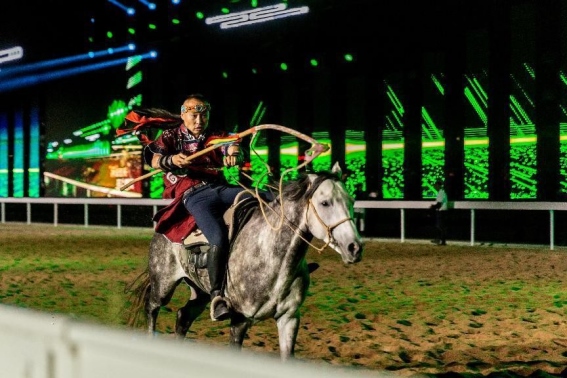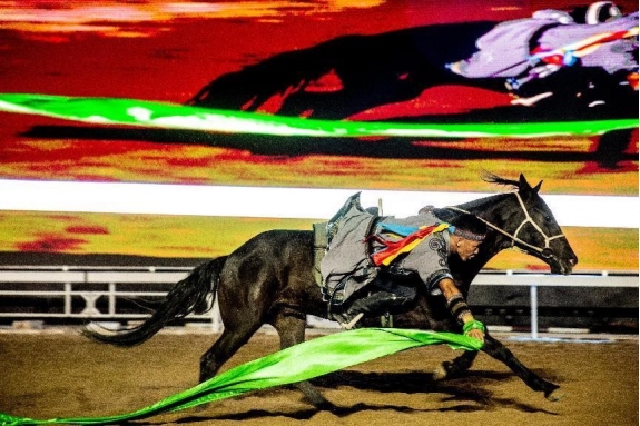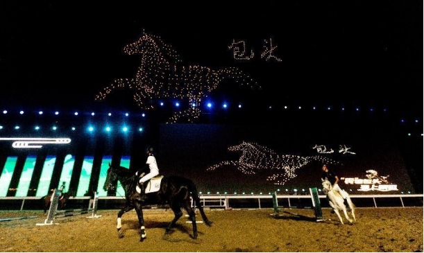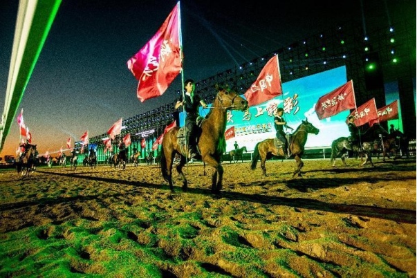 開幕式文體表演由《馬術(shù)方陣一馬當(dāng)先》、歌伴舞《我的城我的馬》、《名馬展示策馬揚鞭》、《單馬技巧雙翼神馬》、《馬障礙秀躍馬揚鞭》、《馬術(shù)秀人馬合一》、歌伴舞《騎跡包頭》、《無人機秀馬上精彩》八塊內(nèi)容組成。當(dāng)晚的賽汗塔拉馬術(shù)賽場流光溢彩、氣氛熱烈,場內(nèi)座無虛席、歡聲雷動。20時30分許,主騎手手持國旗,副騎手手持馬城旗幟,運動員方陣、民族方陣、女騎方陣、馬主方陣入場,騎手們精神飽滿、英姿颯爽,不時揮手致意,現(xiàn)場觀眾用熱烈的掌聲和歡呼聲,歡迎他們的到來。達(dá)茂旗9歲賽馬冠軍阿茹樂手持彩旗引出世界名馬亮相,40對人馬合一的“千古馬頌”表演震撼全場,1000架無人機躍然天空,點亮“騎跡包頭 馬上精彩”的字樣……藍(lán)天、碧水、凈土的包頭在策馬奔騰的馬術(shù)競技中拉開了“中國馬城”的壯麗畫卷。