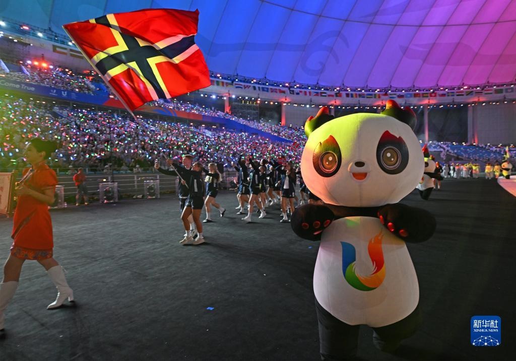 7月28日,挪威大學(xué)生體育代表團(tuán)在開幕式上入場。