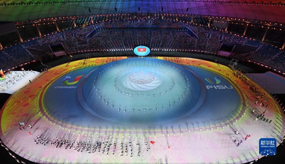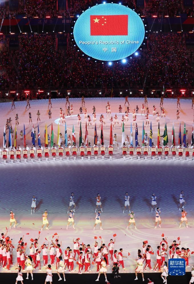 當(dāng)晚,第31屆世界大學(xué)生夏季運(yùn)動會開幕式在成都東安湖體育公園主體育場舉行。