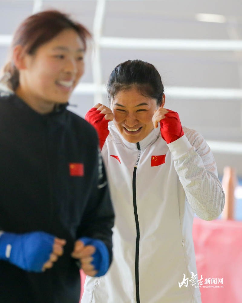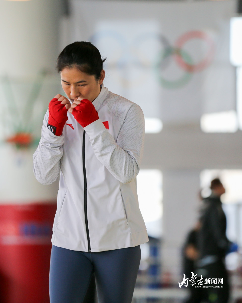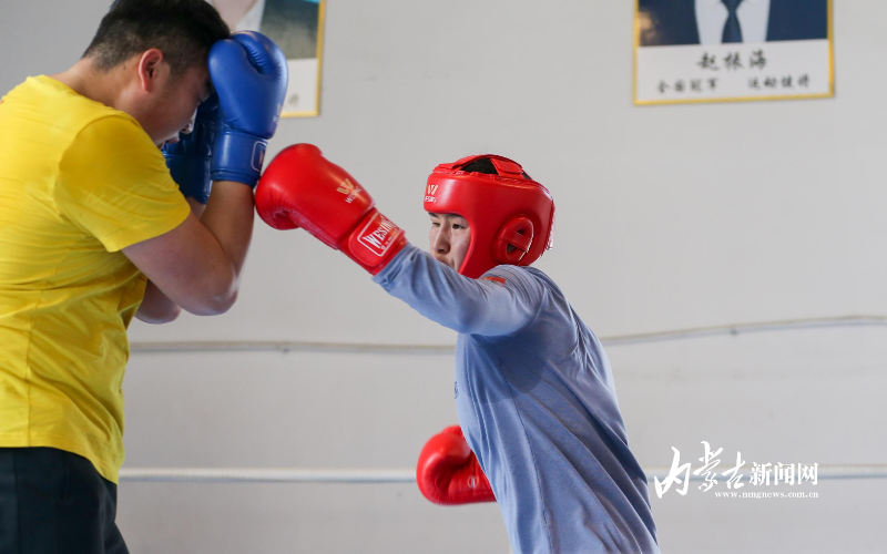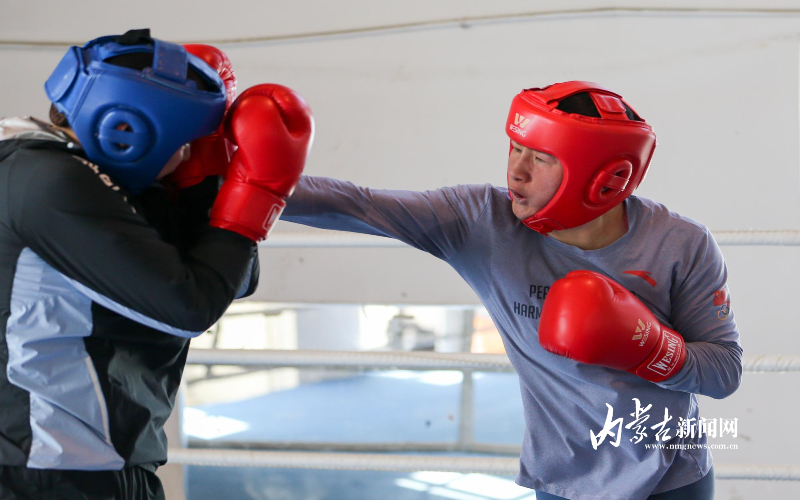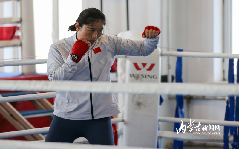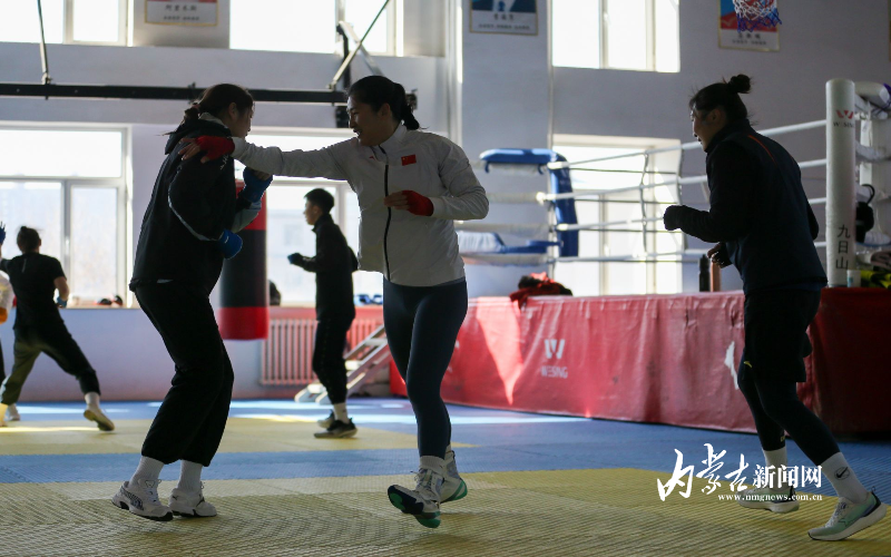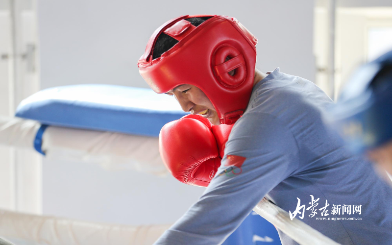 當(dāng)日,記者在拳擊館內(nèi)看到,在訓(xùn)練中李倩腳步輕盈,汗珠在額頭滑落。她戴上拳套,走向沙袋,一記記重拳砸出,發(fā)出沉悶的“砰”聲。內(nèi)蒙古女子拳擊隊的數(shù)十名拳手正在同時訓(xùn)練,沙袋晃動,呼吸急促,空氣中彌漫著汗水與堅持的味道。“防守,腳下要穩(wěn)!”內(nèi)蒙古拳擊隊總教練哈達(dá)巴特爾的聲音在空間回蕩。李倩的訓(xùn)練格外嚴(yán)格。除了常規(guī)力量訓(xùn)練、反應(yīng)訓(xùn)練和體能循環(huán),她還要進(jìn)行一對一的與男拳手的實戰(zhàn)模擬,幾次交鋒下來,氣息都愈發(fā)急促。但李倩沒有退縮,反而越打越穩(wěn),腳步靈活,出拳干凈利落。