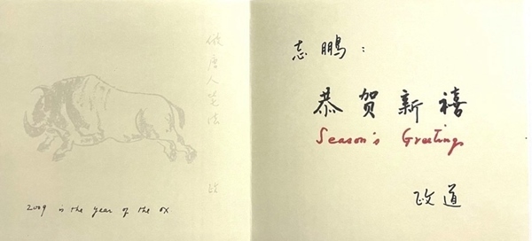 2009年為農(nóng)歷已丑年,俗稱牛年。李政道在賀年卡上畫了一頭健壯的牛。這頭牛騰起四蹄,犄角對著前方,勇猛無比。淡淡的筆墨,精準的線條,黑白的布局,一頭開山牛躍然紙上。牛尾的右上部,他用鉛筆輕輕寫上了:“仿唐人筆法”。然后簽上了自己名字中的“政”字。