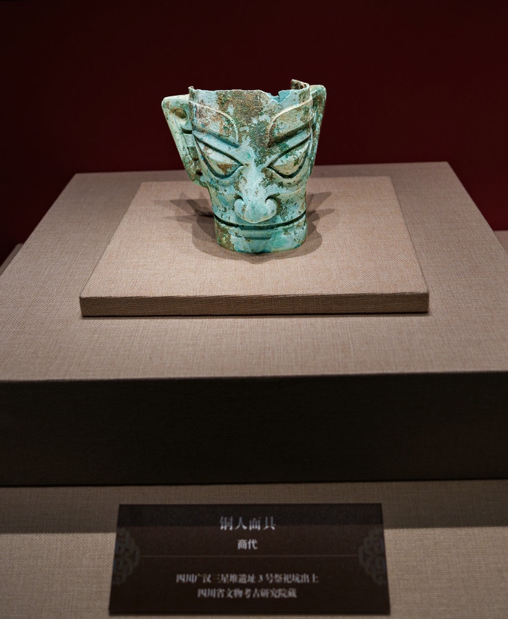 來(lái)自四川廣漢三星堆遺址出土的文物引人關(guān)注,三星堆展品共5件,銅人頭像、銅人面具、銅頂尊跪坐人像肩部龍形裝飾、銅跪坐人像4件真品,銅縱目面具1件復(fù)制品。