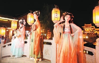 洛邑古城相關(guān)負(fù)責(zé)人介紹,景區(qū)致力于漢服文化的推廣與傳承,創(chuàng)意打造穿越新場(chǎng)景,豐富文旅新業(yè)態(tài)。景區(qū)有24個(gè)朝代的漢服形制、56個(gè)民族的服飾款式,游客可找到各自喜歡的款式,扮演喜愛(ài)的角色。燈獅畫橋、香羅幔天、文峰暮鼓等30余處場(chǎng)景,讓游客盡享“穿越自由”。洛邑古城還策劃了一系列創(chuàng)新主題活動(dòng),讓身著漢服的游客與“李白”“武則天”談古論今,與“嫦娥”“牡丹花神”近距離互動(dòng)。