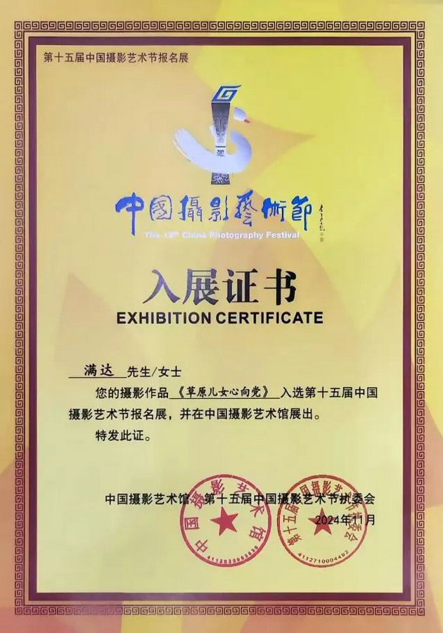 近日,內(nèi)蒙古畫報(bào)社記者滿達(dá)攝影作品《草原兒女心向黨》入選第十五屆中國(guó)攝影藝術(shù)節(jié)報(bào)名展。