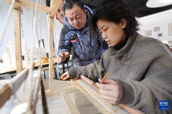 2月19日,柯翔祥(左)在德清莫干山鎮(zhèn)由蠶種場改造的絲綢技藝展示館給從西安前來研學的大學生介紹緙絲技術。