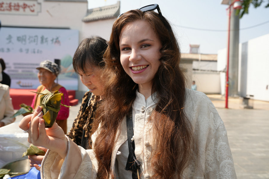 活動(dòng)現(xiàn)場(chǎng),粽香四溢,歡聲笑語(yǔ)此起彼伏。大家圍在一起,捋粽葉、填糯米、扎絲線,共同體驗(yàn)包粽子的傳統(tǒng)習(xí)俗。手法嫻熟的村民手把手教授外國(guó)友人包粽子的技巧,不一會(huì)兒,一個(gè)個(gè)形態(tài)各異的粽子便擺滿了桌。來(lái)自烏克蘭的留學(xué)生安吉麗娜學(xué)得格外認(rèn)真,她一邊模仿著村民的動(dòng)作,一邊忍不住贊嘆:“喜歡包粽子,粽子好吃!”言語(yǔ)間滿是對(duì)中國(guó)傳統(tǒng)美食的喜愛。
