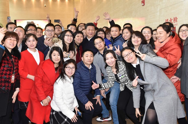 2016年2月19日,習(xí)近平到中央新聞單位調(diào)研。圖為習(xí)近平與人民日?qǐng)?bào)社人民網(wǎng)員工合影。