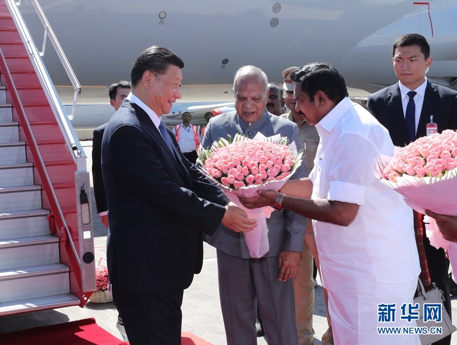 10月11日,國家主席習近平乘專機抵達金奈,應(yīng)印度共和國總理莫迪邀請,出席中印領(lǐng)導(dǎo)人第二次非正式會晤。印度泰米爾納德邦邦長普羅希特、首席部長帕拉尼斯瓦米等在舷梯旁迎接,向習近平敬獻鮮花。