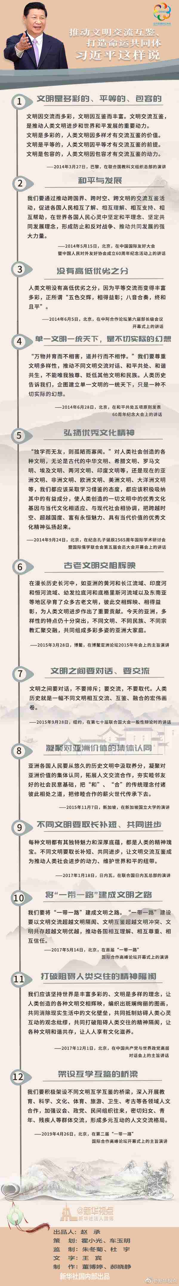亞洲文明對(duì)話大會(huì)將于5月15日在北京開幕。圍繞“亞洲文明交流互鑒與命運(yùn)共同體”主題,大會(huì)將為亞洲文明互學(xué)互鑒、繁榮發(fā)展搭建平臺(tái)。關(guān)于文明交流互鑒,習(xí)近平主席有過哪些精辟論述?讓我們一起聆聽。