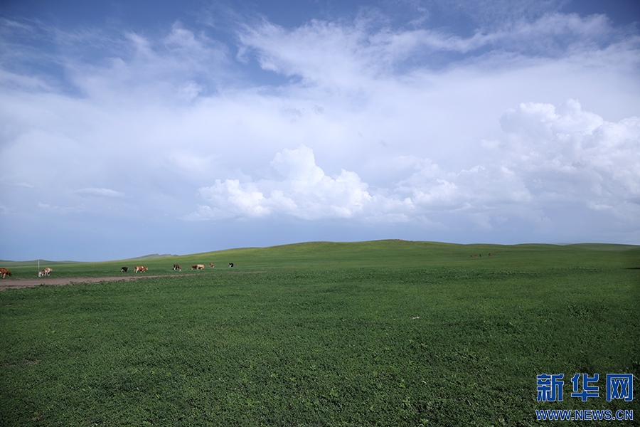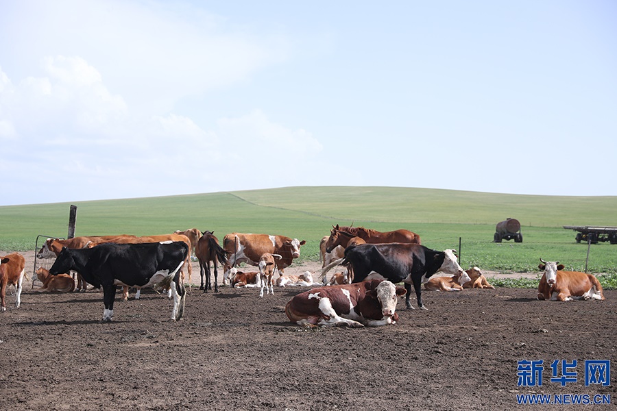 8月2日,其日麥拉圖家的幾頭牛在草場(chǎng)上吃草。新華網(wǎng)記者焦鵬攝