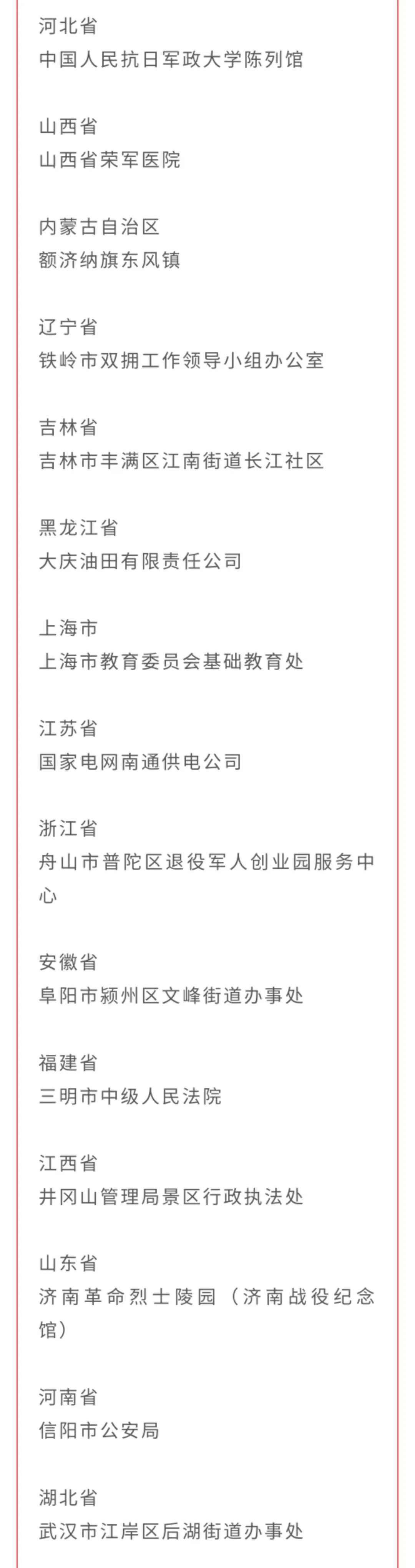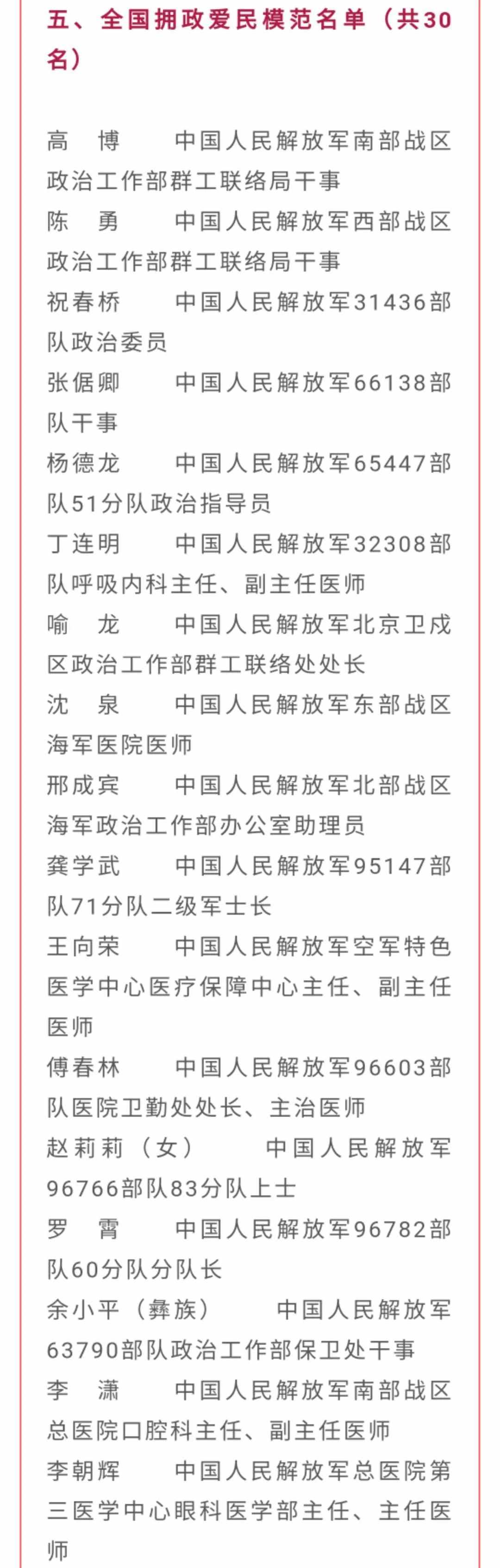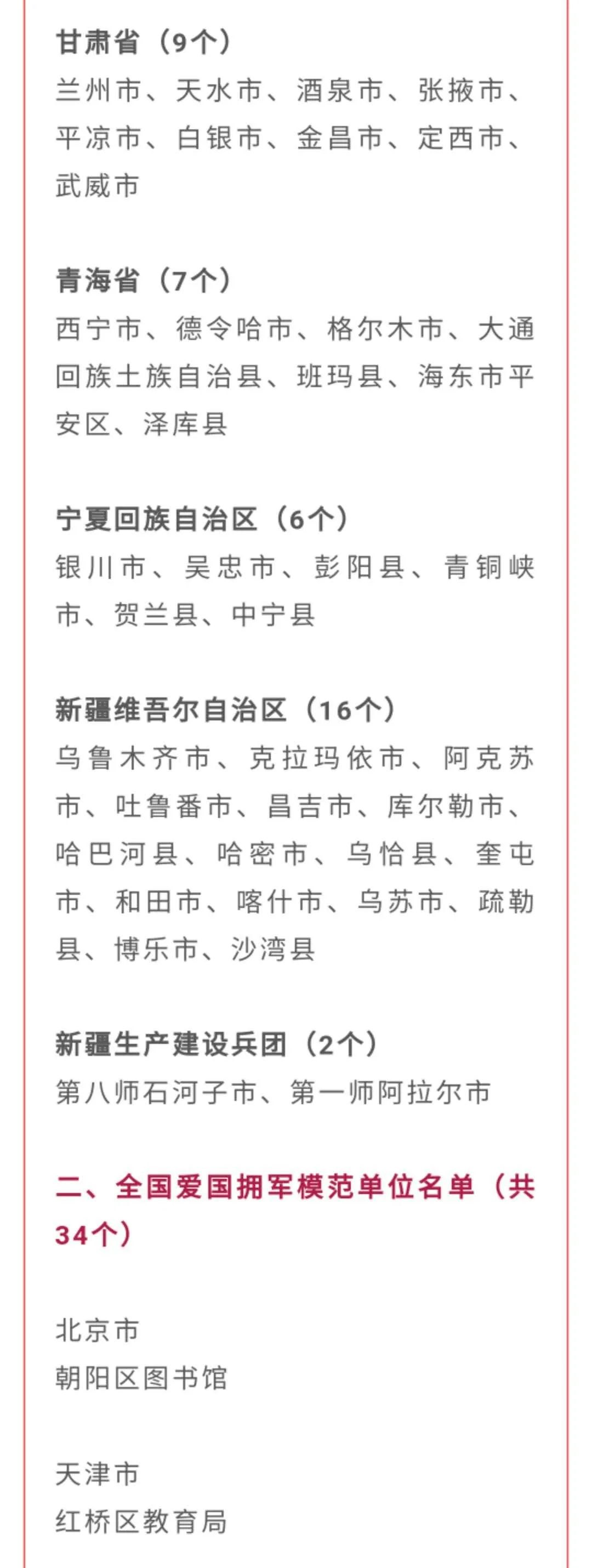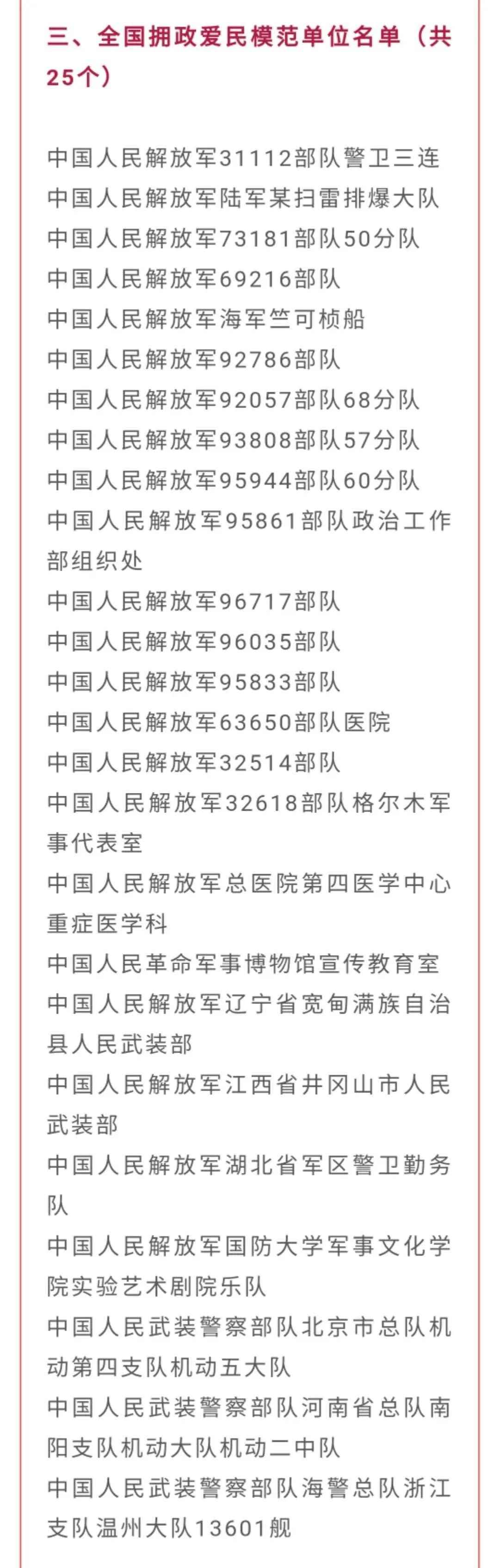 全國(guó)雙擁模范城(縣)、全國(guó)愛國(guó)擁軍模范單位和擁政愛民模范單位、全國(guó)愛國(guó)擁軍模范和擁政愛民模范名單