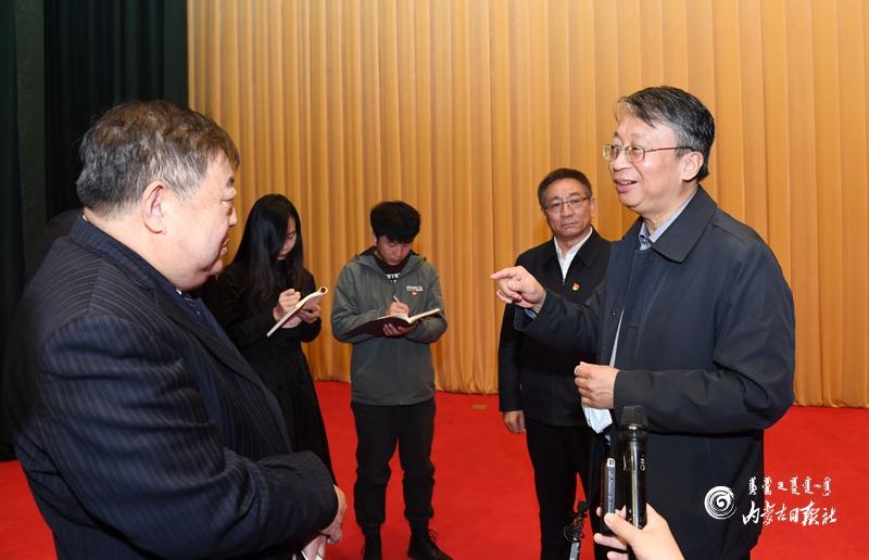 11月8日上午,在學(xué)習(xí)貫徹黨的十九屆五中全會精神中央宣講團內(nèi)蒙古報告會結(jié)束后,聆聽報告會的部分人員與宣講人沈春耀互動交流。內(nèi)蒙古日報記者 袁永紅 攝