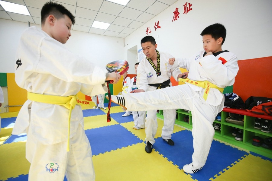 夏學(xué)偉老師正在教同學(xué)們練習(xí)跆拳道  彭瑞誠(chéng) 攝影