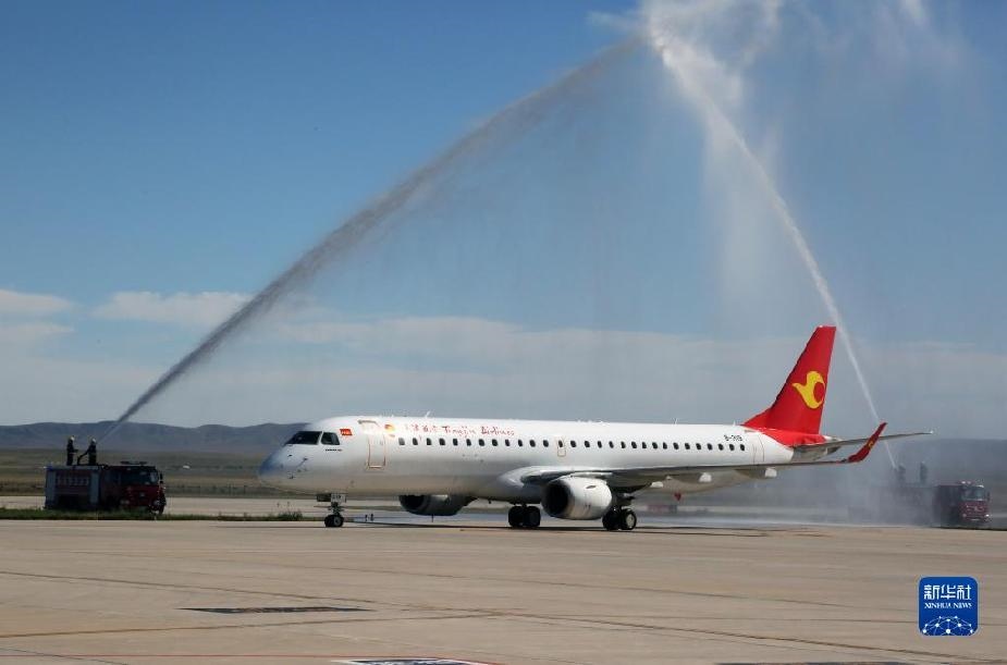 錫林浩特直飛烏蘭浩特航班舉行過水門儀式。新華社記者李云平攝