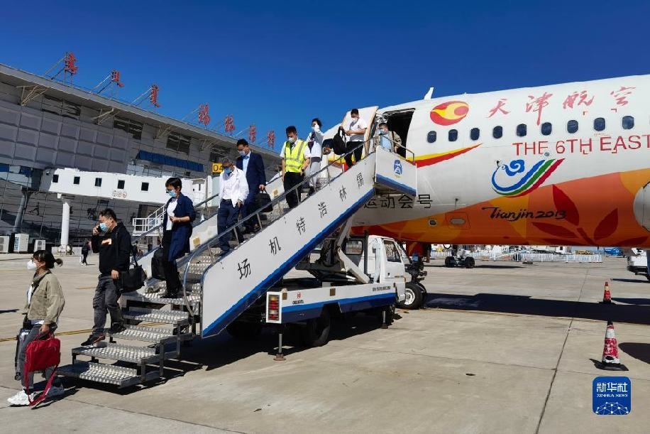 旅客乘坐航班從呼和浩特抵達(dá)錫林浩特機場。新華社記者李云平攝