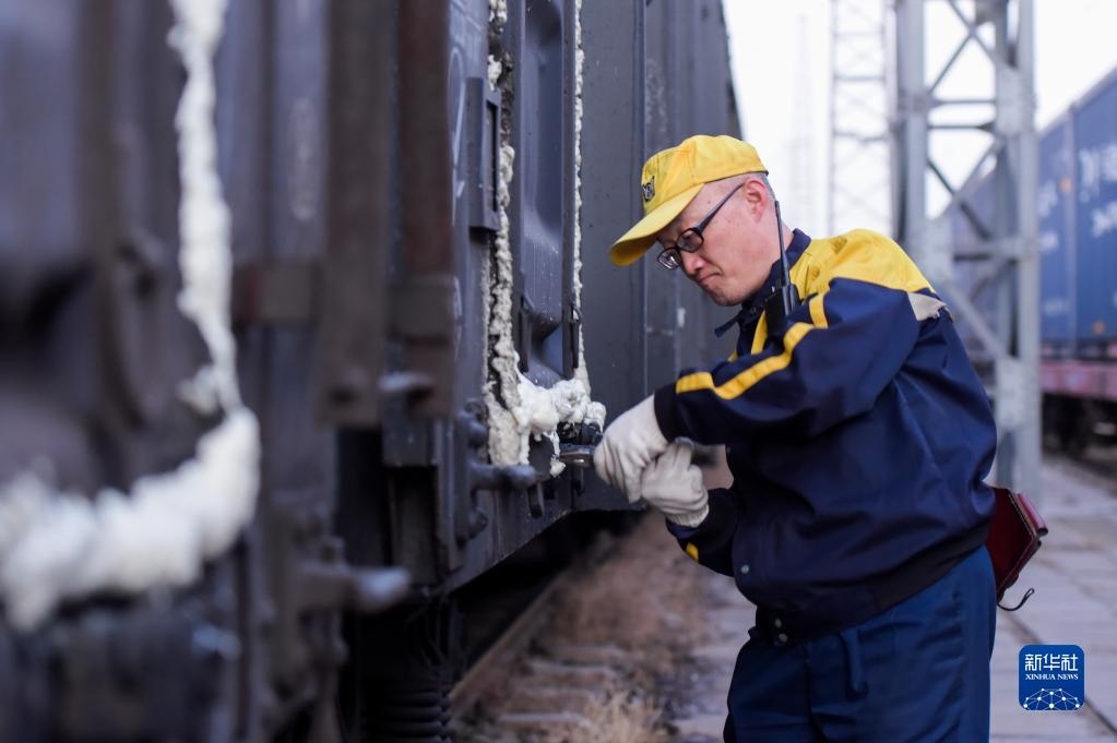 11月23日,在中鐵呼和浩特局包頭西站,工作人員在檢修運(yùn)煤列車。新華社記者朱文哲攝