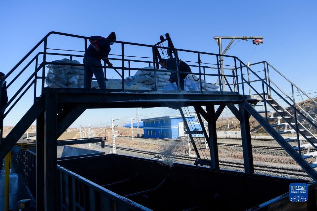 11月23日,在位于鄂爾多斯市的淮河能源西部煤電集團(tuán)色連二礦罕臺川集裝站,工作人員在給運(yùn)煤列車鋪撒防凍粉。新華社記者李志鵬攝
